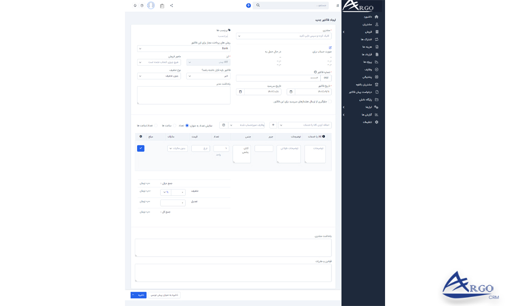 بخش فروش در نرم افزار آرگو CRM شامل پیشنهادات، پیش فاکتور ها، فاکتورها، پرداخت ها، یادداشت های اعتباری، کالا یا خدمات می باشد که در ادامه به توضیح هر یک می پردازیم.